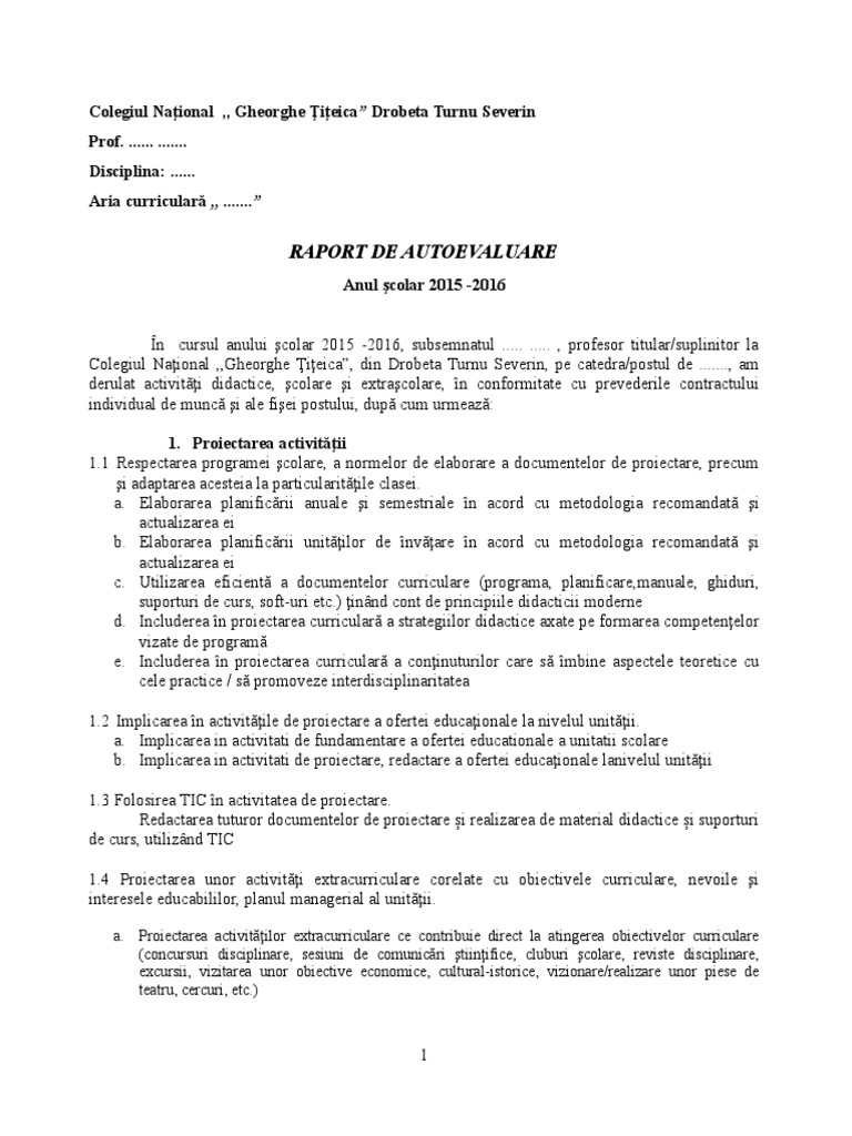 Raport De Autoevaluare Profesori Model