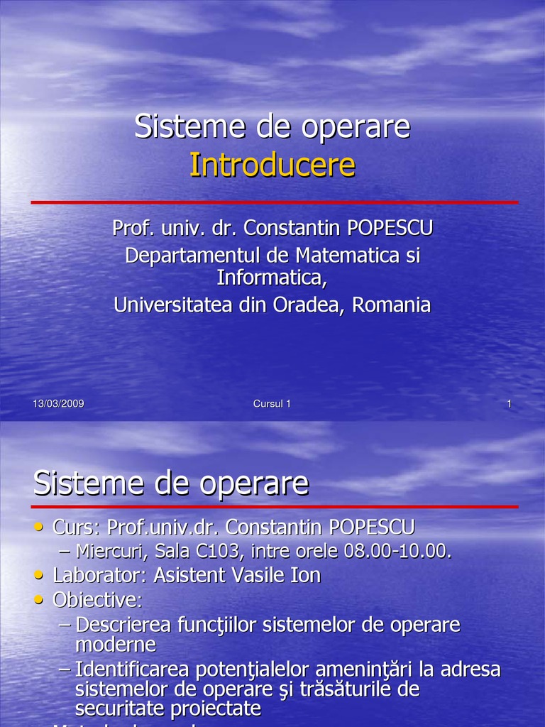 Sisteme de operare 1, curs 1. Curs în sisteme de operare. Sisteme de operare introducere ce este un sistem de operare pot fi identificate patru componente de ale unui sistem de operare: